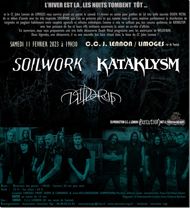 En accord avec GARMONBOZIA Inc, une très belle affiche death métal mélodique se prépare au CC John Lennon de Limoges avec les très respectés SOILWORK que l'on ne présente plus et qui, comme vous le savez, maitrise parfaitement la distribution de torgnole en jonglant habilement entre couplets agressifs et refrains mélodiques. Comme si cela ne suffisait pas, nos cousins québécois de KATAKLYSM assurerons la soirée en co-tête d'affiche. A cela un troisième groupe sera prochainement annoncé et WILDERUN ouvrira cette soirée.